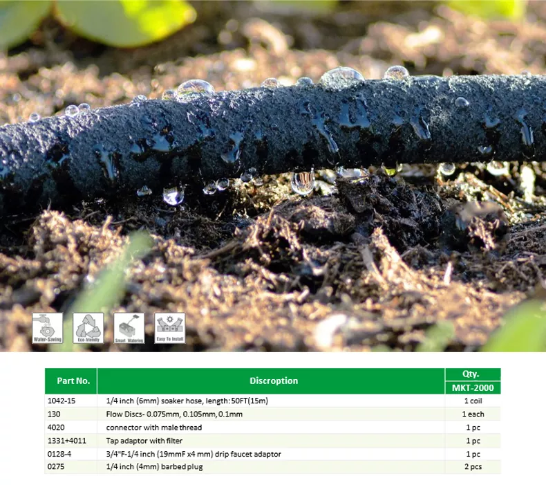 СТАРТОВЫЙ НАБОР ШЛАНГА ДЛЯ ЗАМАЧКИ своими руками MKT-2000 1. Легко создать эффективный и удобный полив. система для вашего сада 2. Шланг для замачивания экономит до 70% больше воды, экономя вы деньги и помощь в сохранении наших природных ресурсов 3. Содержит все, что вам нужно для настройки орошения из шланга для замачивания. система