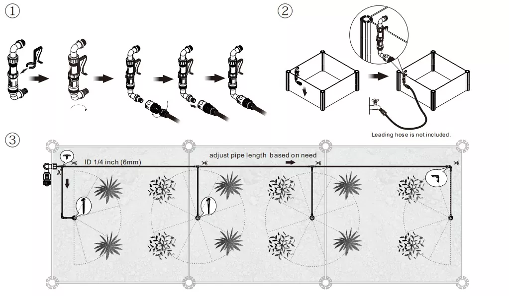 Форсунки на 180° и 360° можно свободно комбинировать в зависимости от положения посадочной грядки, а трубопровод длиной 2 метра позволяет гибко регулировать зону покрытия. Будь то узкая и длинная посадочная корыта или квадратный посадочный ящик, он точно покроет почву.
