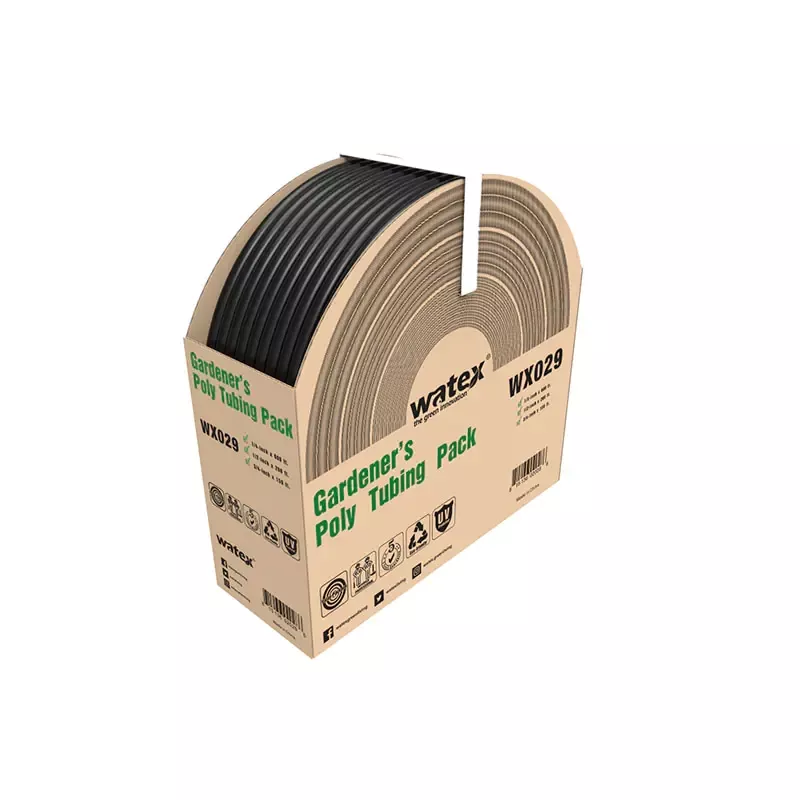 Серия труб для водоснабжения из ПЭ/ПВХ долговечна, но гибка и доступна с внутренним диаметром 4 мм, 13 мм, 19 мм и 25 мм. Его легко развернуть и уложить ровно, не запутывая, что делает его идеальным для планирования маршрутов трубопроводов от источника воды и выбора подходящего размера трубы в зависимости от требуемой скорости потока. Совместимый с фитингами Watex и трубными хомутами, он обеспечивает быстрое соединение без использования инструментов и беспроблемную установку. К концу можно подключить ирригационные капиллярные трубки диаметром 4 мм, что делает его хорошо подходящим для стандартных ирригационных систем низкого давления.