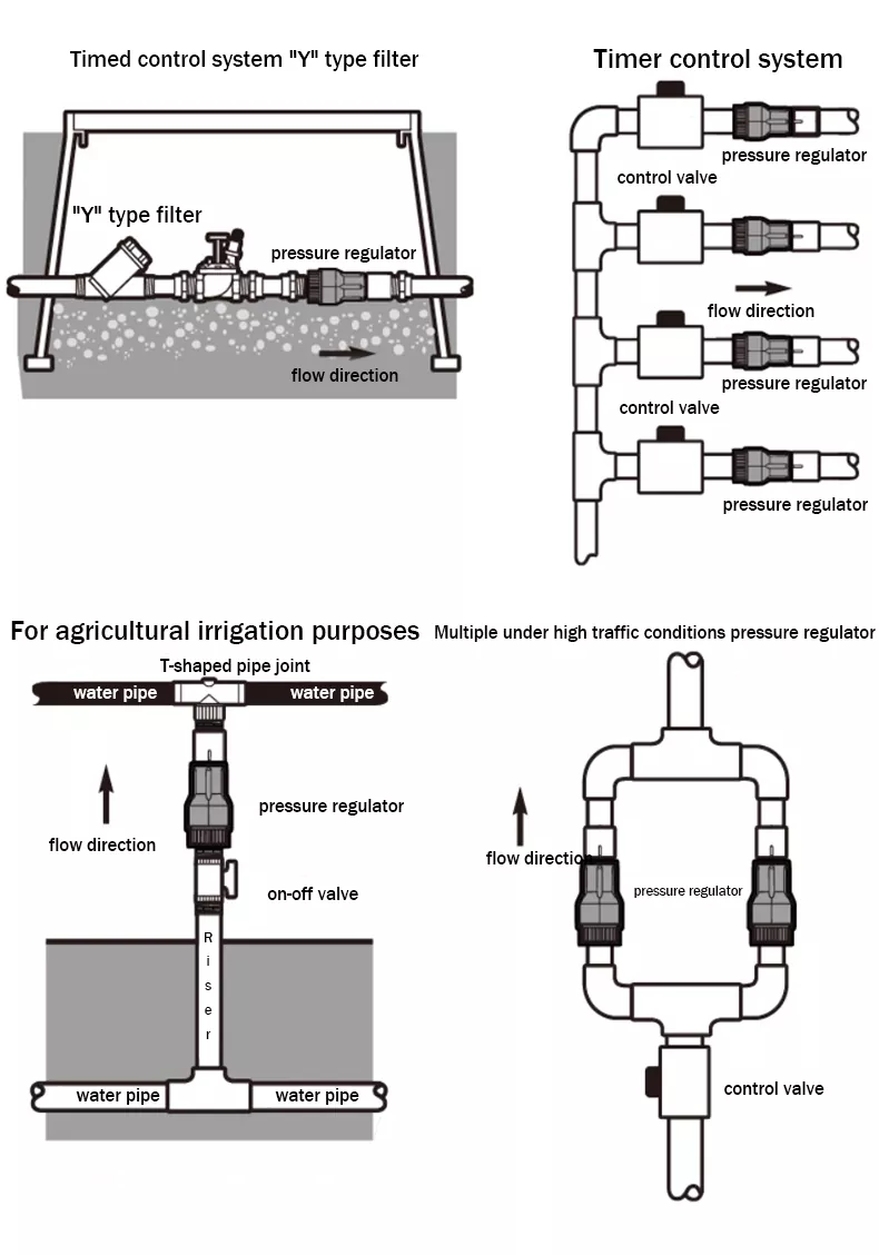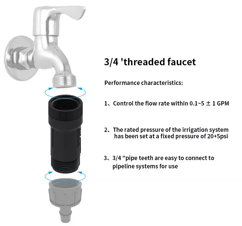 Регулятор давления подходит как для внутренних, так и для наружных ирригационных систем диаметром 13 мм/19 мм/25 мм. Его основная функция – стабилизировать давление и поток воды путем регулирования изменения входного давления, обеспечивая стабильную производительность для конечного капельного орошения, спринклерных систем и других систем орошения с низким расходом. Он совместим со всеми типами капельного орошения, системами низкого расхода и мобильными спринклерными машинами, что делает его идеальным для водосберегающих систем орошения.