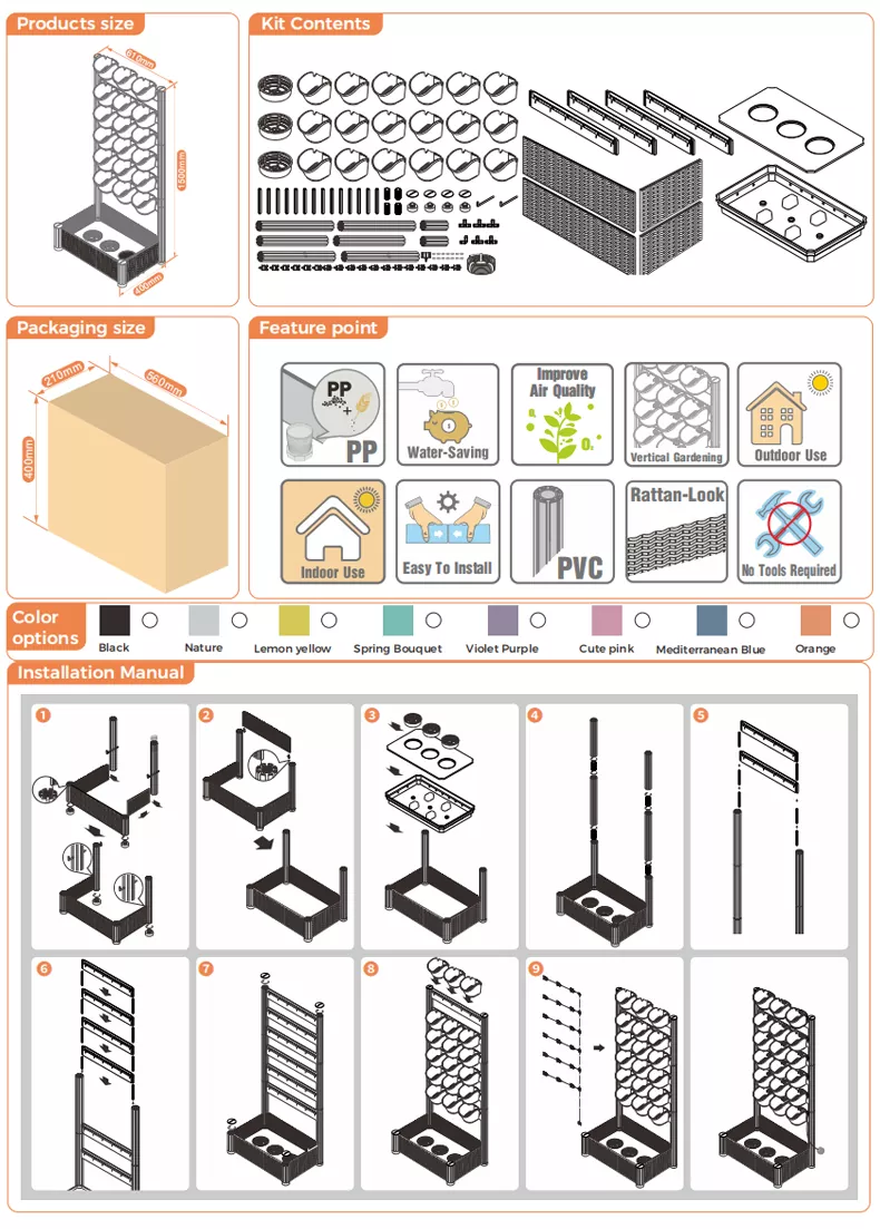 Никаких сложных инструментов готовить вообще не нужно. Просто следуйте пошаговым инструкциям по сборке, и установка будет завершена очень быстро. Модульная конструкция отличается особой гибкостью и так же проста, как сборка из блоков. Несколько блоков также могут быть свободно соединены, будь то украшение небольшого пространства или крупномасштабная композиция, с ними легко обращаться.